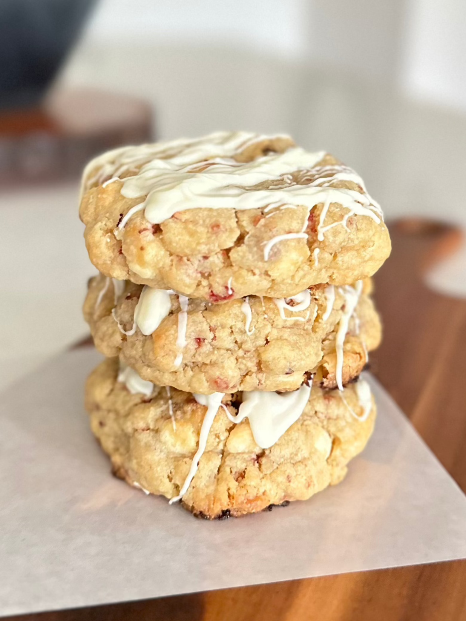 A cookie that tastes like summer. Our Strawberry Cookie is soft, thick, and packed with real freeze-dried strawberries and creamy cream cheese chips, then finished with a drizzle of melted cream cheese chips for the perfect sweet touch. It’s the perfect balance of bright berry flavor and creamy richness, making it a must-have for strawberry lovers and cookie fans alike.